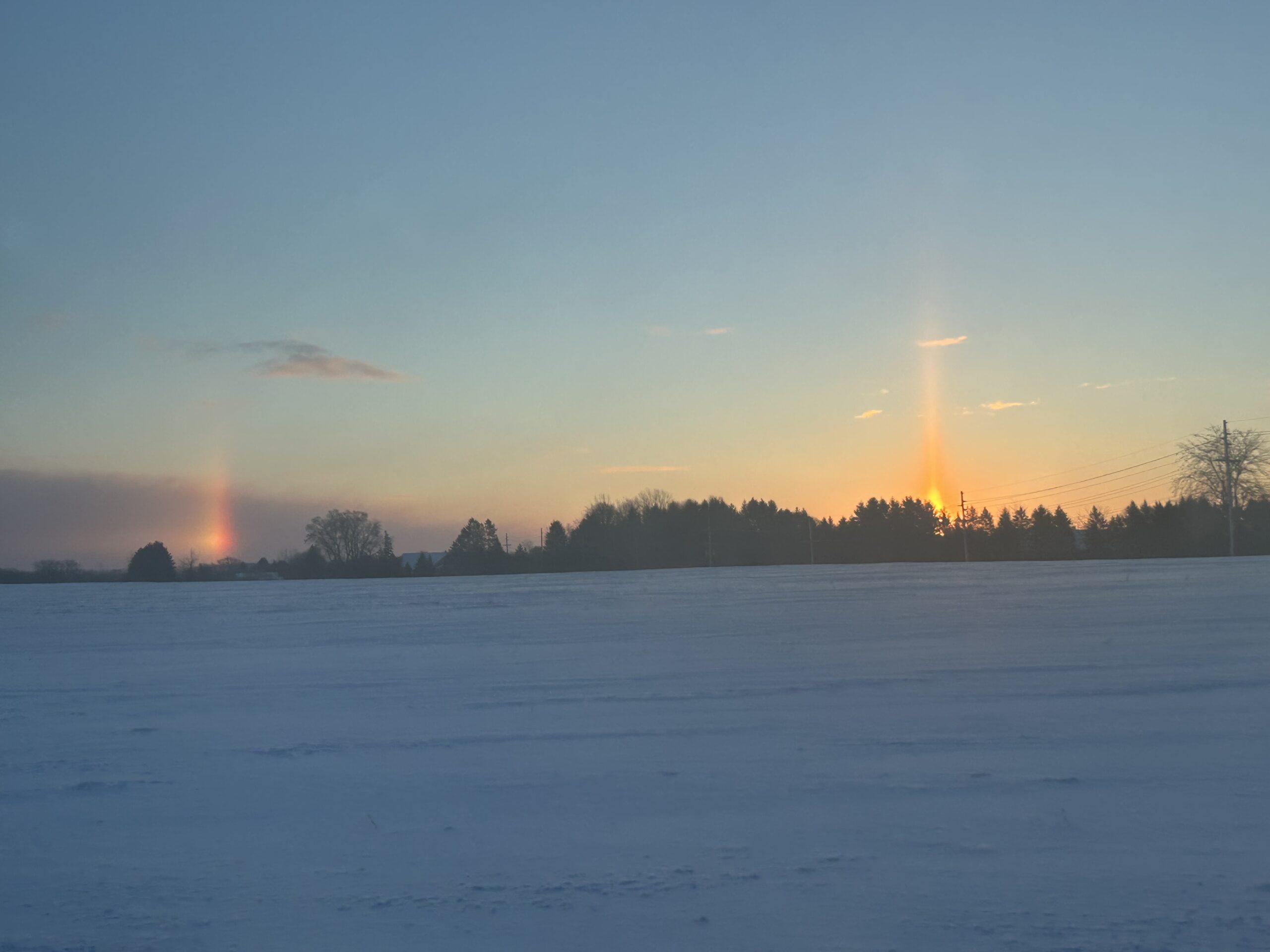Ok, is there really such a word? The answer is yes! It happens when the rising sun shines off snow crystals in the air. The above image shows the rising sun on the right and snow crystals revealing an orange and red stream of color. The vertical bands of color are straight up and down, unlike the normal arc curve of a typical rainbow. There was another upward band to the right of the sun … off camera.